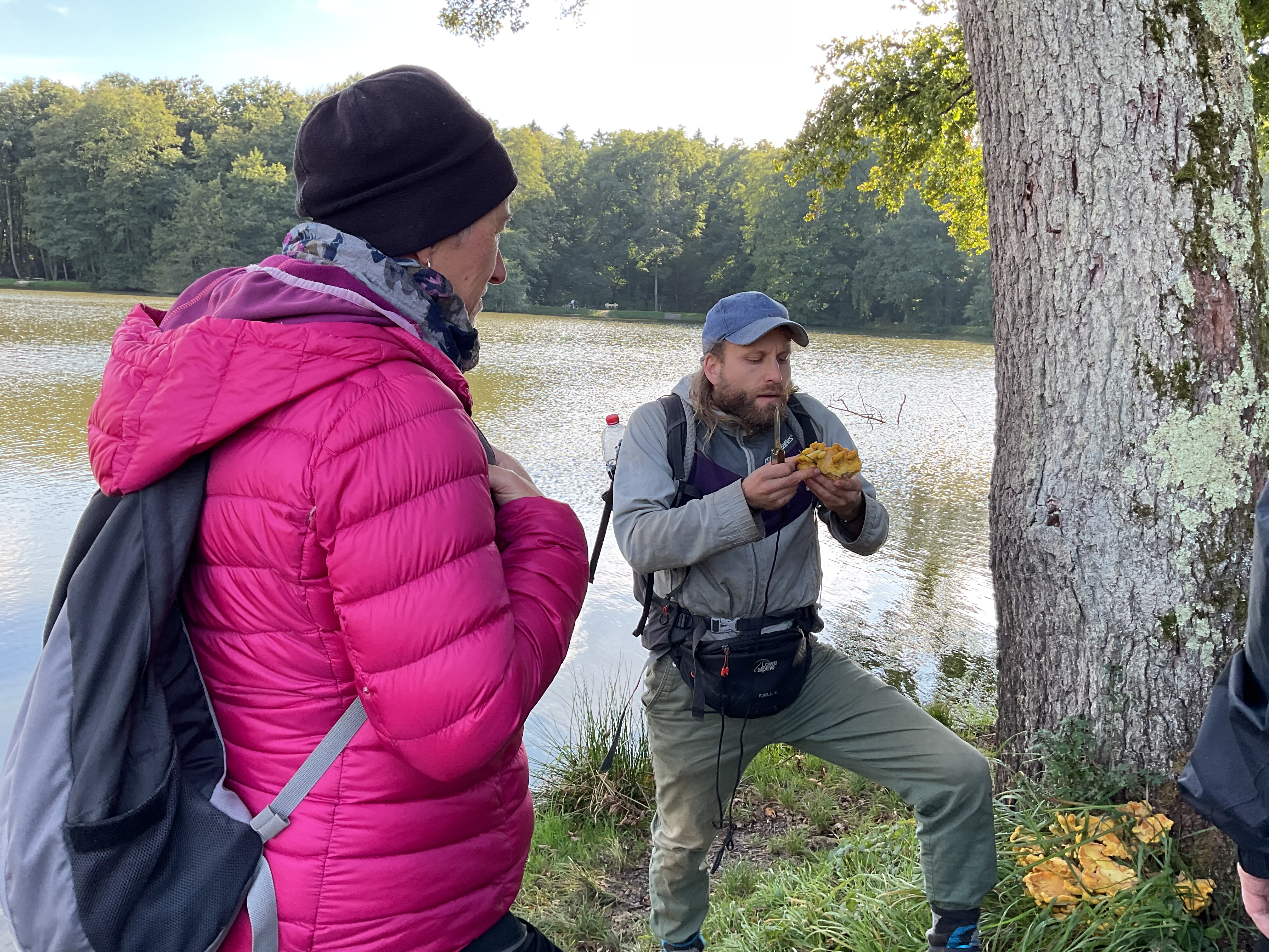 Moi tenant un morceau de polypore soufré, champignon parasite très bon comestible