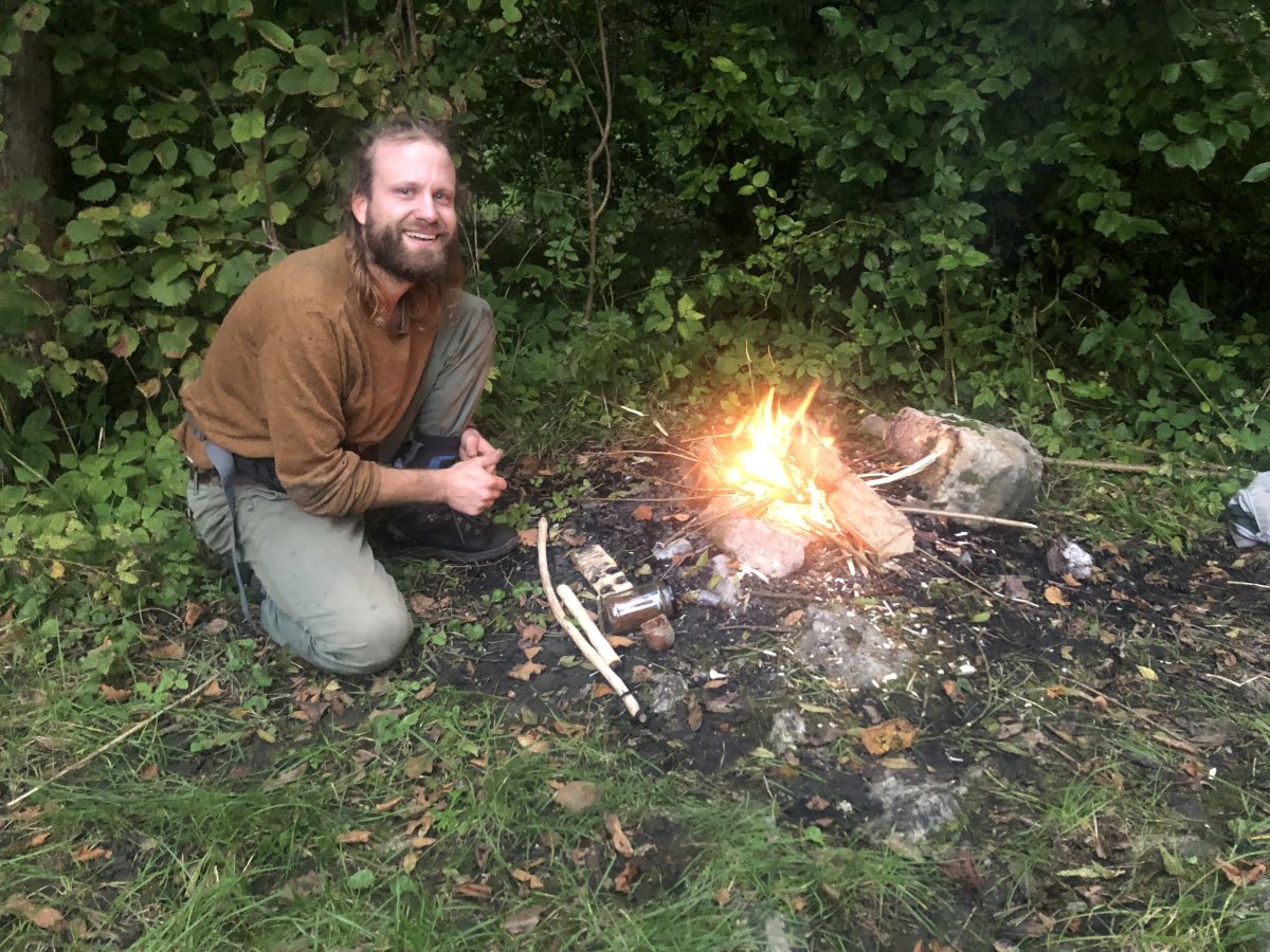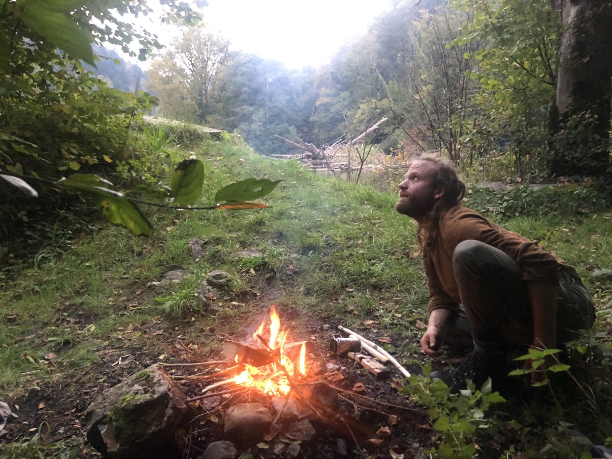 Feu allumé à l'ancienne, par friction, au bord du Doubs