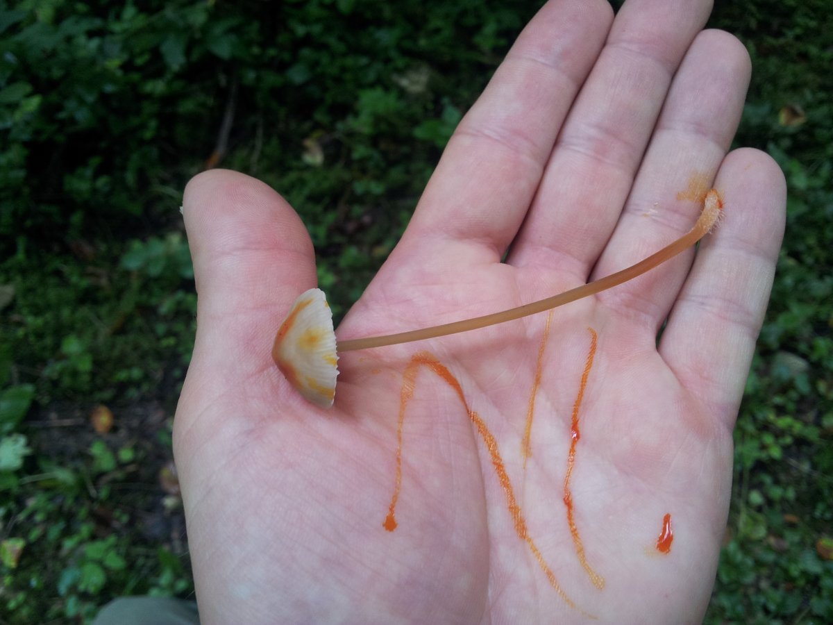 Mycena crocata avec son jus orange qui sort de son pied, qui est poilu à la base